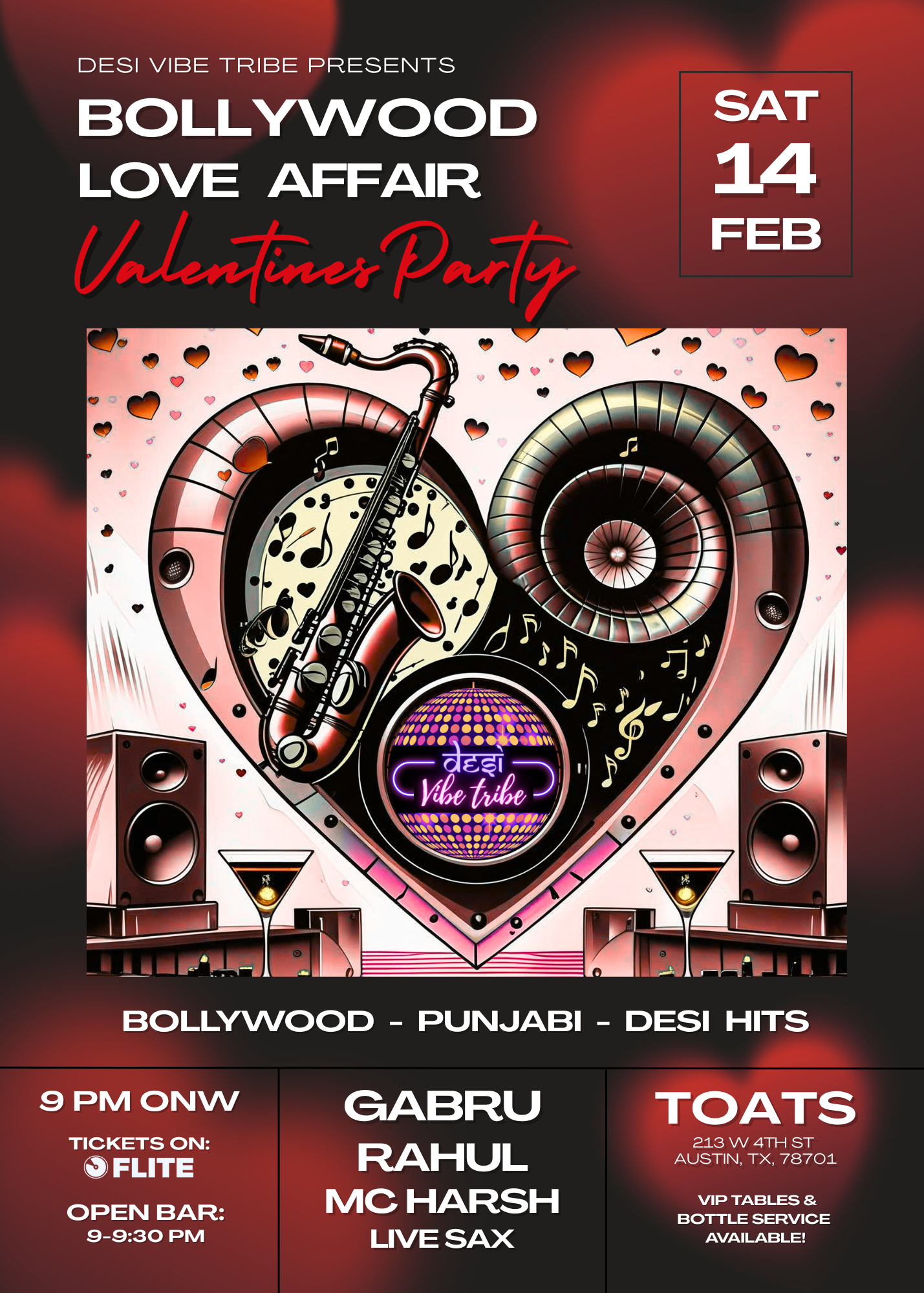 Love songs & Bangers. Nostalgia. Bollywood. And you! This Valentine’s Day, Desi Vibe Tribe invites you to a night where romance meets rhythm and every song feels like a scene from your favorite movie. From the Bollywood love anthems that raised us to Punjabi & Desi hits that keep the dance floor packed, this party is a celebration of music, memories, and moments — whether you’re in love, healing, hopeful, or just ready to dance. Come with your Valentine, your Galentines, or your crew. Come dressed to impress, stay for the vibes, and leave with stories you’ll replay long after the night ends.
